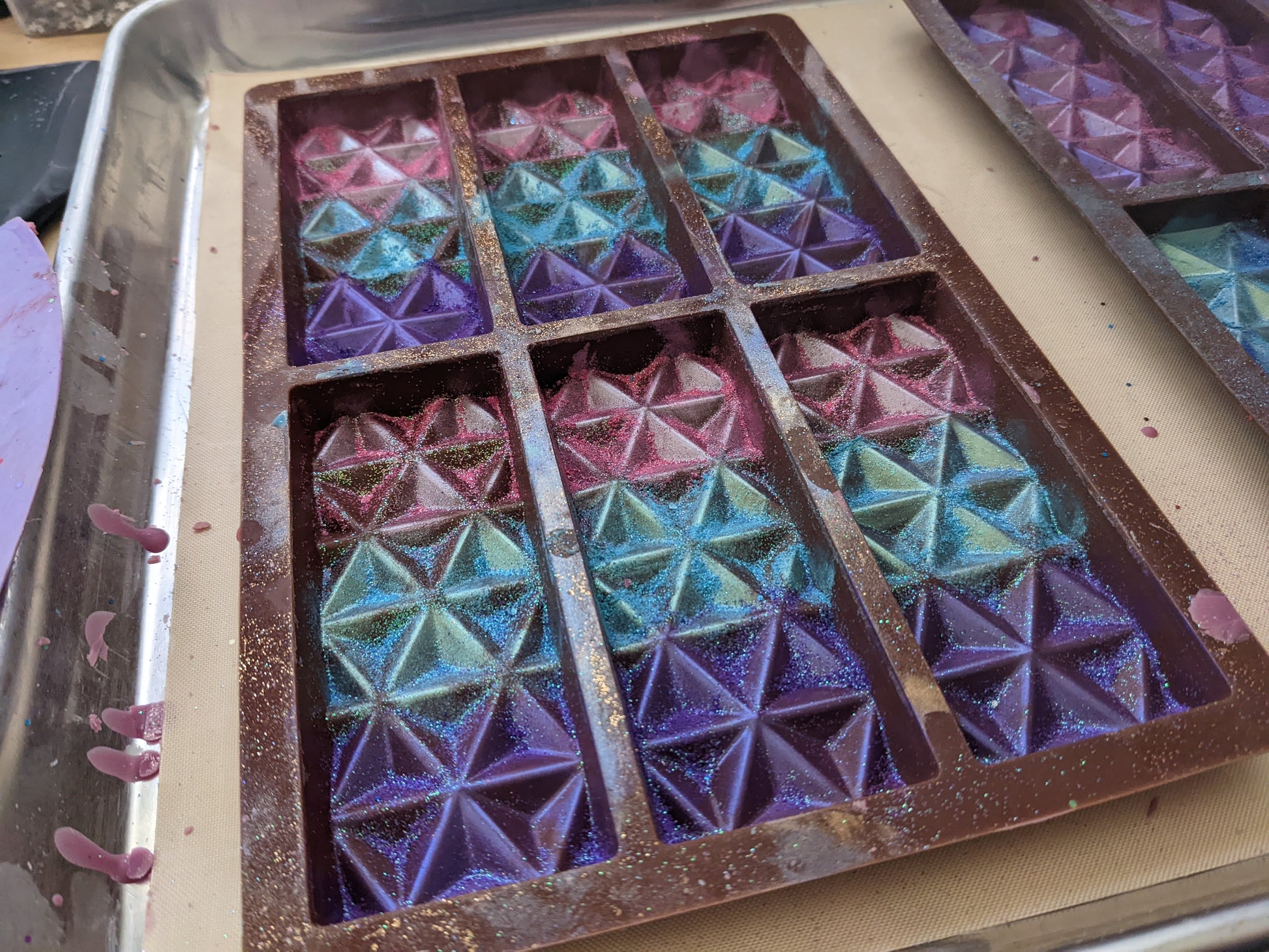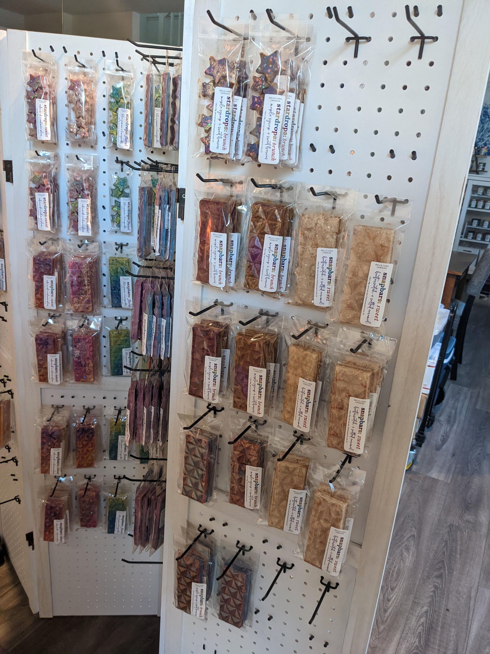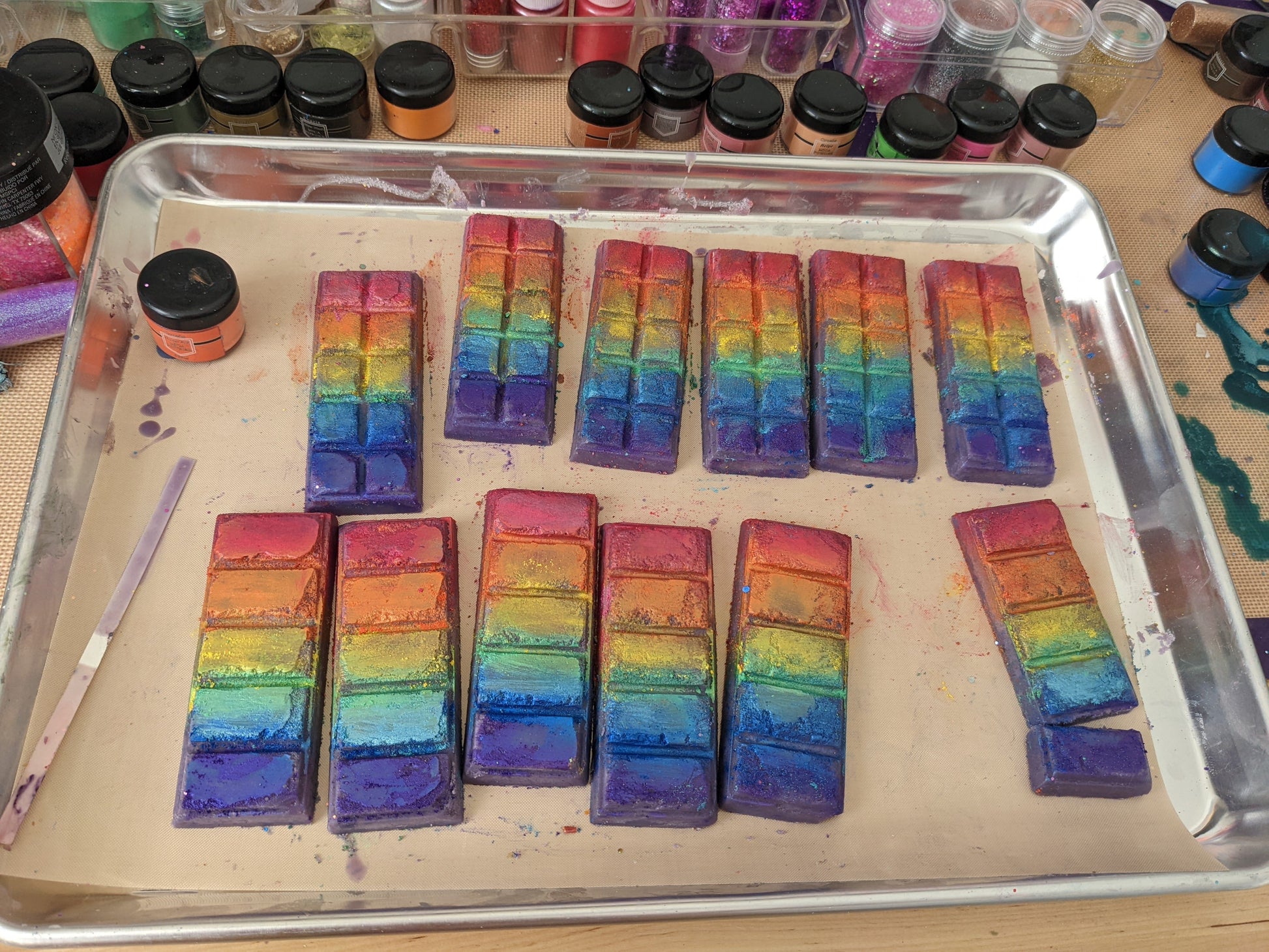 Deliciously scented, Gorgeously decorated!!! Our Snap Bars are hand-decorated with different shimmery mica pigments, and decked out with FABULOUS glittery iridescence!